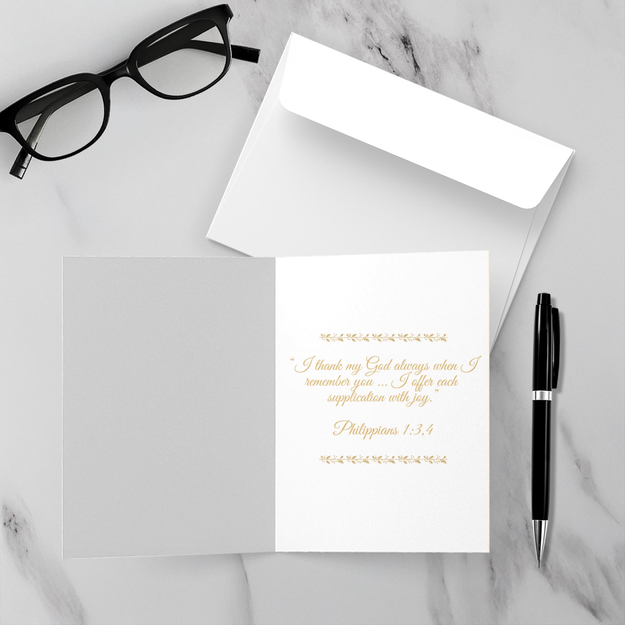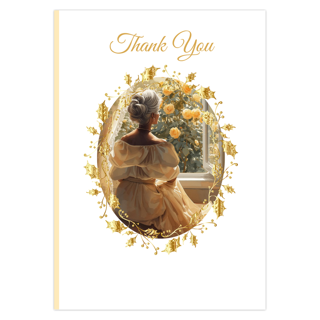 Featuring the Elegant Lady “Thank you” card. Featuring the a thoughtful Bible verse inside. These high quality paper cards come pre-folded, packed in cello sleeves per 10 cards, and includes a white envelope for each card. Works well with regular ballpoint pens after short drying time.