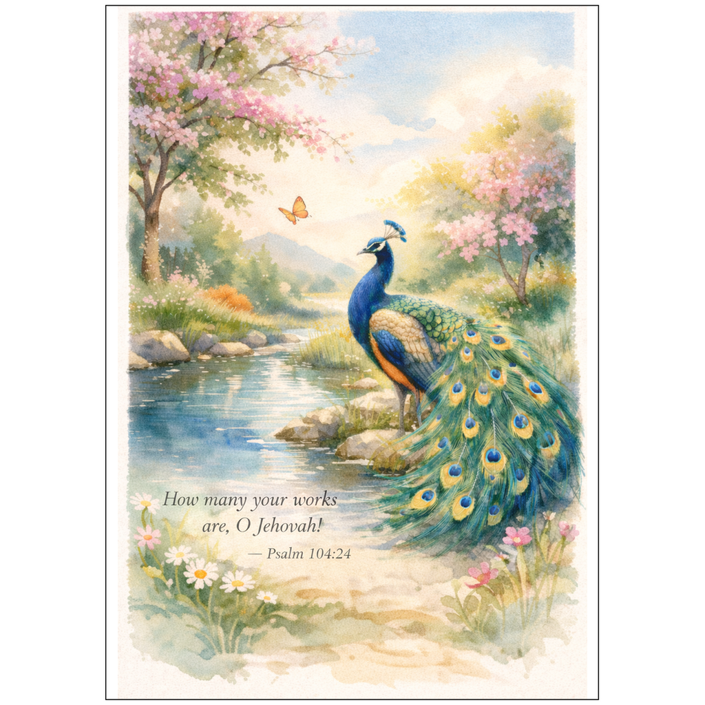 This graceful watercolor artwork features a vibrant peacock standing peacefully beside a gentle stream, surrounded by blooming trees and soft meadow florals. Inspired by the splendor and order found throughout Jehovah’s creation, this scene reflects calm, beauty, and thoughtful appreciation for the works of His hands.