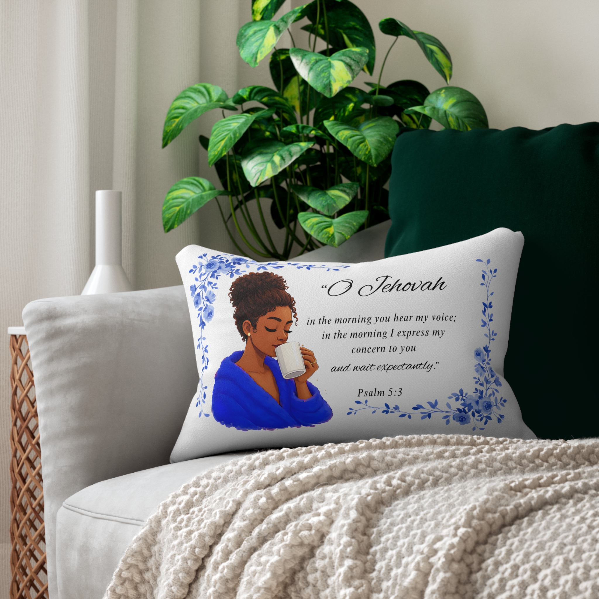 Comfort meets décor with this beautifully designed spun-polyester lumbar pillow to your home décor collection, featuring Psalm 5:3 (NWT) and a thoughtfully illustrated lady enjoying her morning meditation.